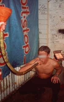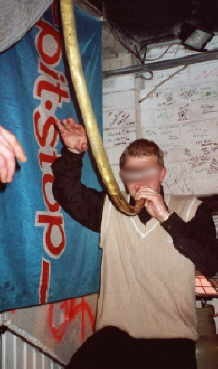 Der Brillenbauer versucht die Leerung des Männerschlauches. Doch schon ist die Hand oben - das Aus - der Druck war zu stark - und so einer ist ausgezogen Meister aller (Schlauchtrinker-) Klassen zu werden... Schalke setzt direkt danach den selben Schlauch an. Sieht am Anfang auch gleich viel vielversprechender aus ... aber doch nur 'ne Sekunde ... das Ergebnis gibt's dann in der Abkackerliste, aber ohne Foto - das wäre dann doch einfach zu bitter für den Erfinder des Schlauches!!! Zurück durch Klick auf die Bilder! |
