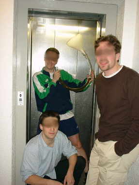 Die Premiere steht bevor. Der erste Liftschlauch der Menschheit wird gleich vom GSM geleert. "Der Umsatz..." muss mit seiner Kiste die Tür blockieren, damit auch Bilder von dieser Sensation gemacht werden können.